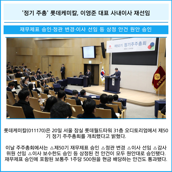 [카드] '정기 주총' 롯데케미칼, 이영준 대표 사내이사 재선임