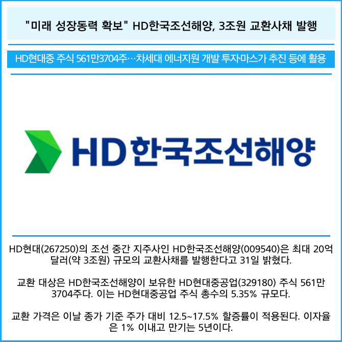 [카드] "미래 성장동력 확보" HD한국조선해양, 3조원 교환사채 발행
