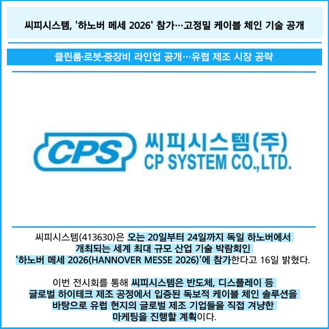 [카드] 씨피시스템, '하노버 메세 2026' 참가…고정밀 케이블 체인 기술 공개