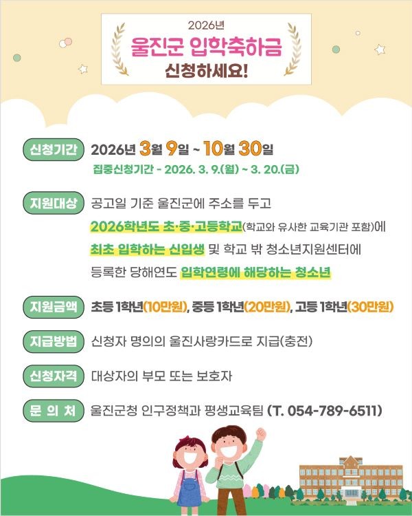 울진군, 초·중·고 신입생 입학축하금 1차분 지급···632명 1억3210만원 지급