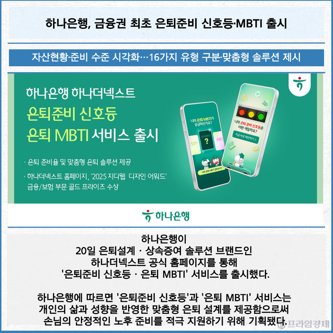 [카드] 하나은행, 금융권 최초 은퇴준비 신호등·MBTI 출시