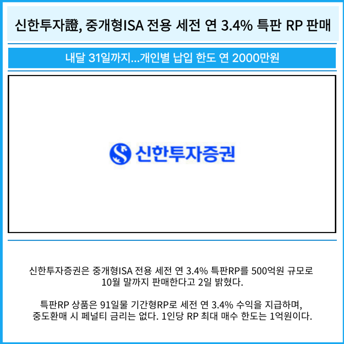 [카드] 신한투자證, 중개형ISA 전용 세전 연 3.4% 특판 RP 판매