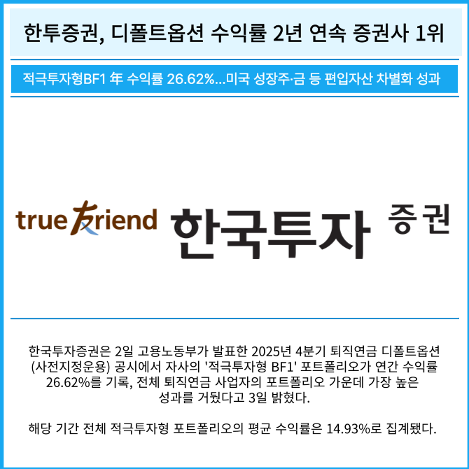 한투증권, 디폴트옵션 수익률 2년 연속 증권사 1위
