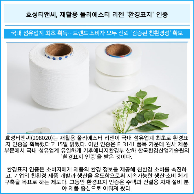 [카드] 효성티앤씨, 재활용 폴리에스터 리젠 '환경표지' 인증