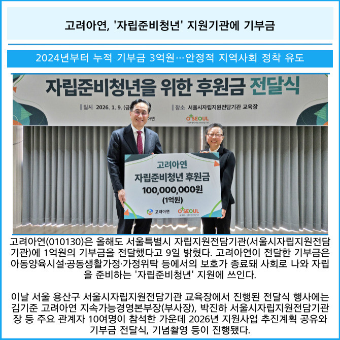 [카드] 고려아연, '자립준비청년' 지원기관에 기부금