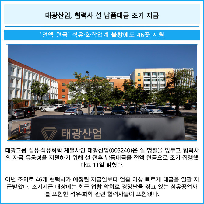 [카드] 태광산업, 협력사 설 납품대금 조기 지급