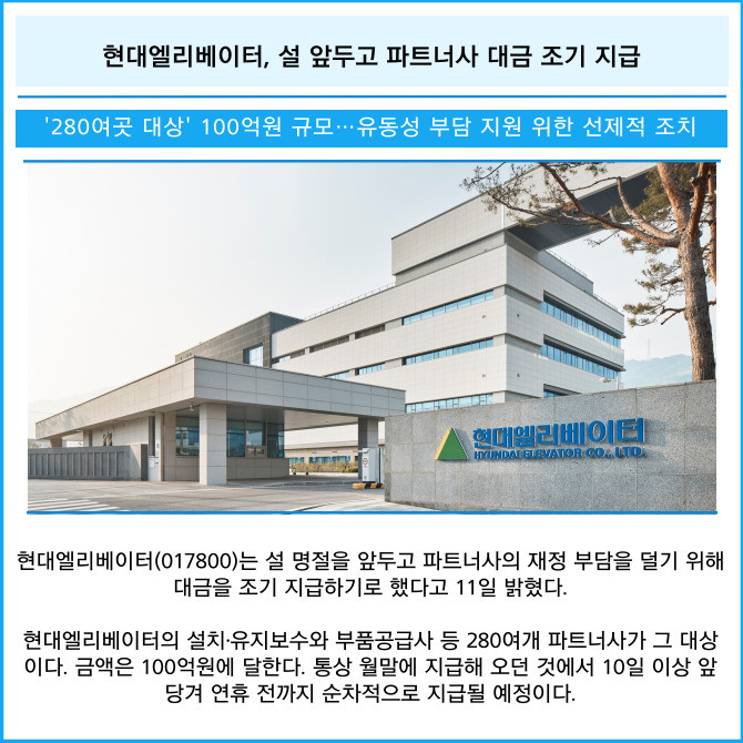 [카드] 현대엘리베이터, 설 앞두고 파트너사 대금 조기 지급