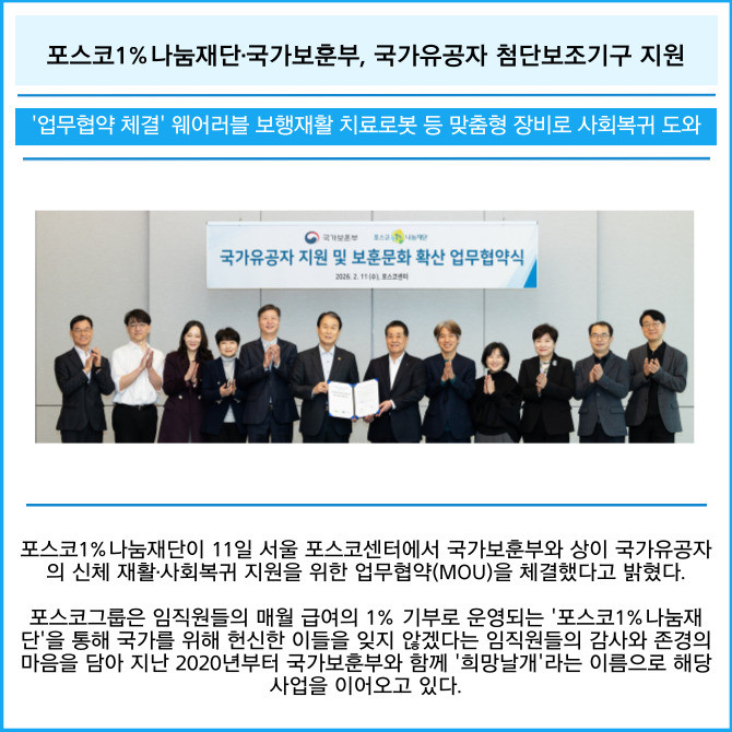 [카드] 포스코1%나눔재단·국가보훈부, 국가유공자 첨단보조기구 지원