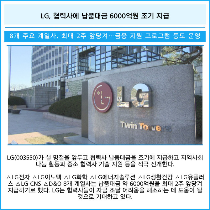 [카드] LG, 협력사에 납품대금 6000억원 조기 지급