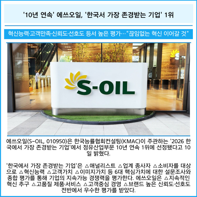 [카드] '10년 연속' 에쓰오일, '한국서 가장 존경받는 기업' 1위
