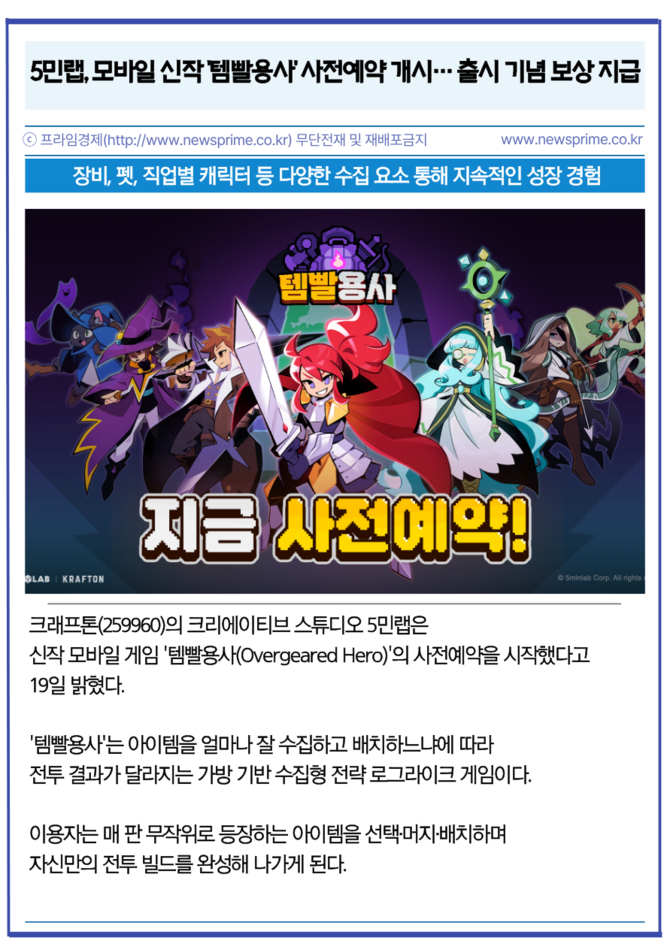 [카드] 5민랩, 모바일 신작 '템빨용사' 사전예약 개시… 출시 기념 보상 지급