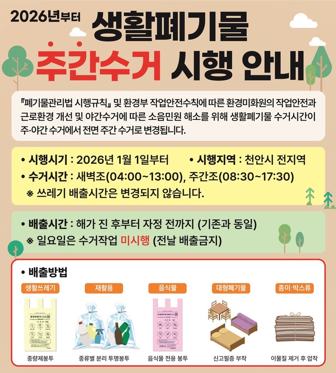 천안시, 내년부터 생활폐기물 '주간 수거' 전환…근로자 안전 강화