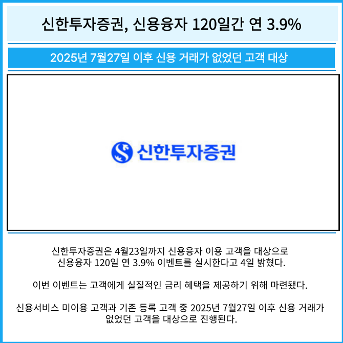 [카드] 신한투자증권, 신용융자 120일간 연 3.9%