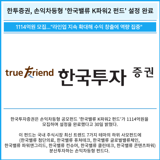 [카드] 한투증권, 손익차등형 '한국밸류 K파워2 펀드' 설정 완료