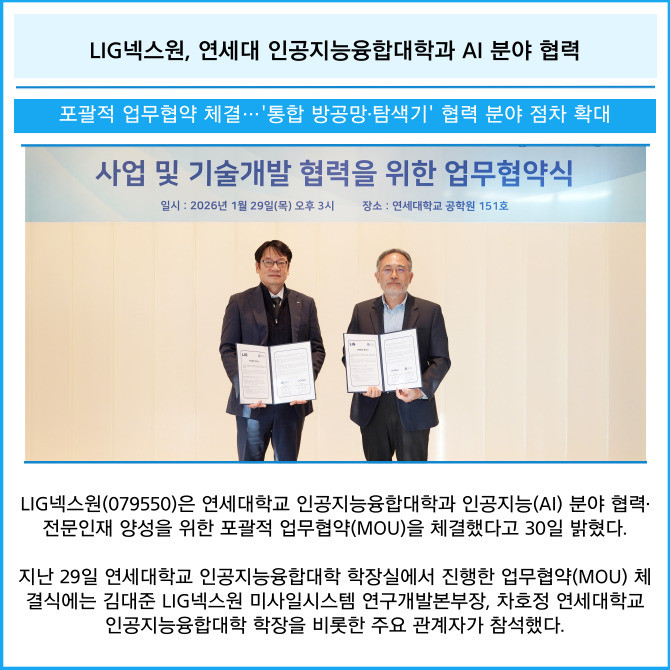 [카드] LIG넥스원, 연세대 인공지능융합대학과 AI 분야 협력