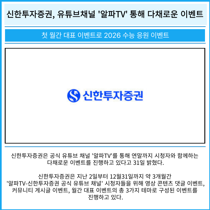 [카드] 신한투자증권, 유튜브채널 '알파TV' 통해 다채로운 이벤트