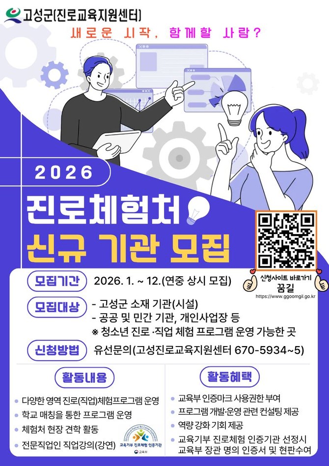 [고성군 소식] 고성군, 2026년 청소년의 꿈터…신규 진로체험처 상시 모집