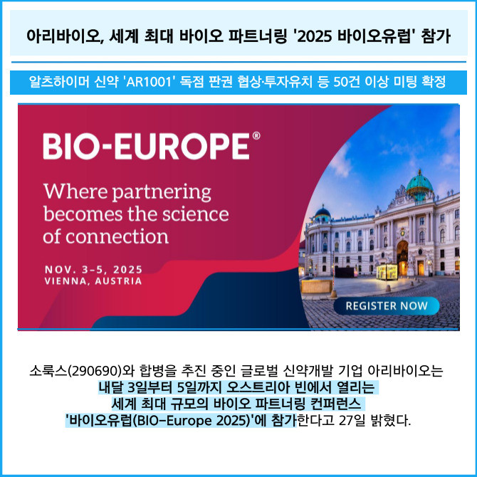 [카드] 아리바이오, 세계 최대 바이오 파트너링 '2025 바이오유럽' 참가