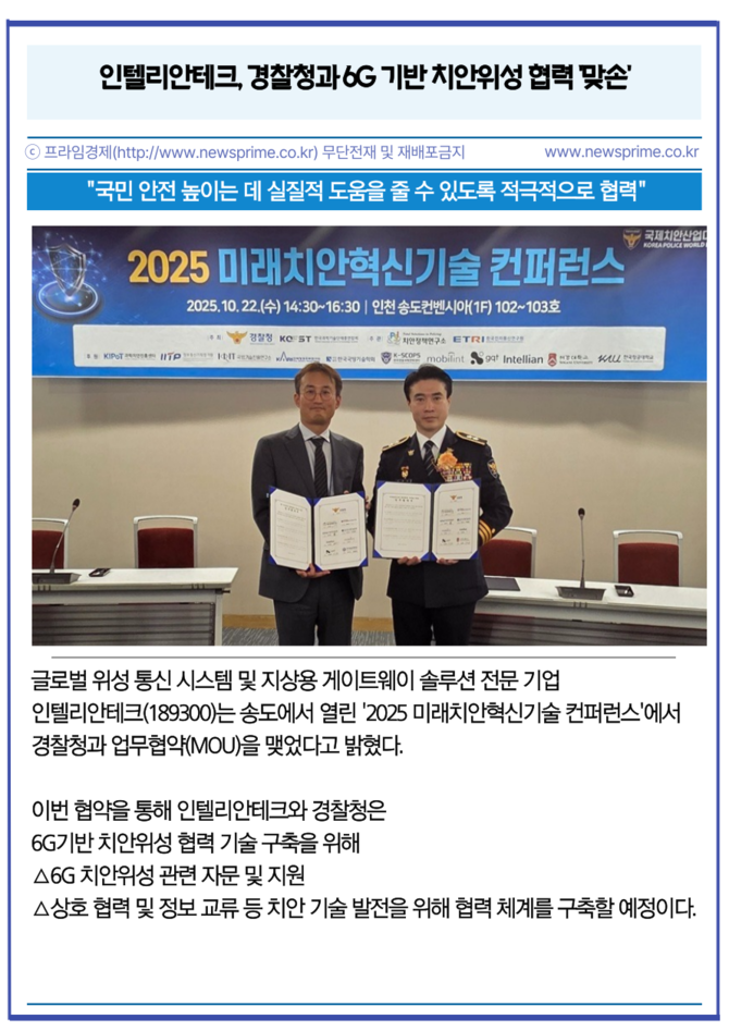 [카드] 인텔리안테크, 경찰청과 6G 기반 치안위성 협력 '맞손'