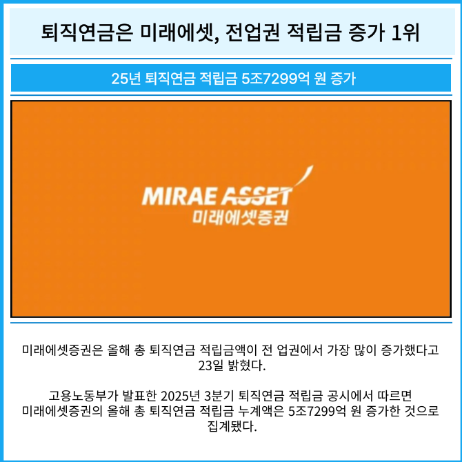 [카드] 퇴직연금은 미래에셋, 전업권 적립금 증가 1위