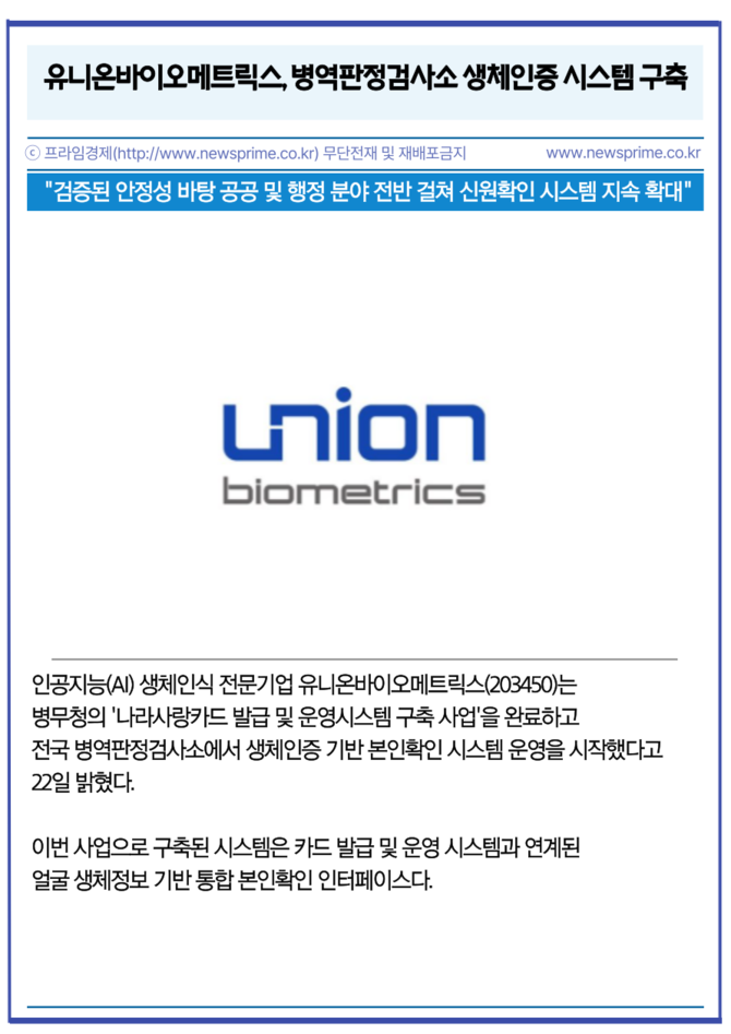 [카드] 유니온바이오메트릭스, 병역판정검사소 생체인증 시스템 구축