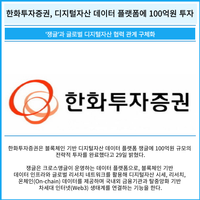 [카드] 한화투자증권, 디지털자산 데이터 플랫폼에 100억원 투자