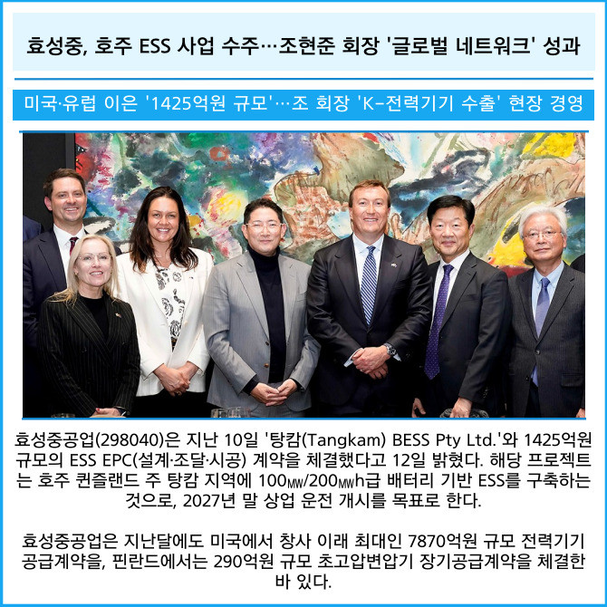 [카드] 효성중, 호주 ESS 사업 수주…조현준 회장 '글로벌 네트워크' 성과