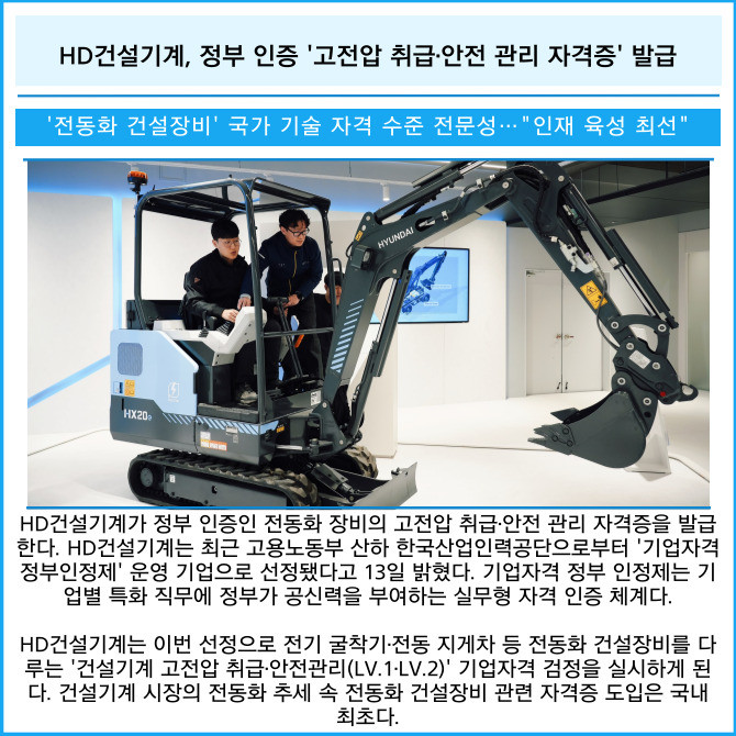 [카드] HD건설기계, 정부 인증 '고전압 취급·안전 관리 자격증' 발급