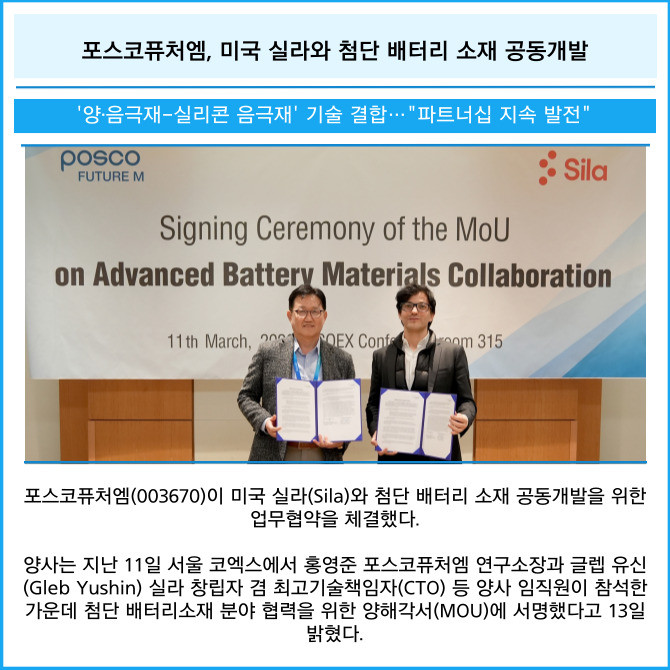 [카드] 포스코퓨처엠, 미국 실라와 첨단 배터리 소재 공동개발