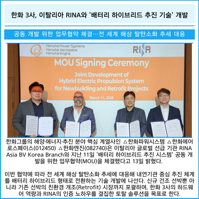 [카드] 한화 3사, 이탈리아 RINA와 '배터리 하이브리드 추진 기술' 개발