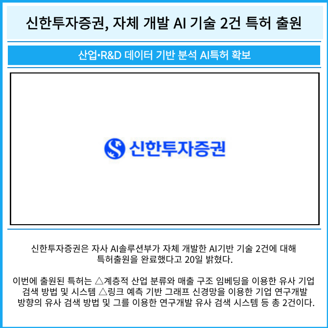 [카드] 신한투자증권, 자체 개발 AI 기술 2건 특허 출원
