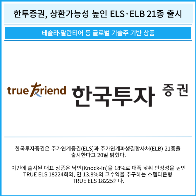 [카드] 한투증권, 상환가능성 높인 ELS·ELB 21종 출시