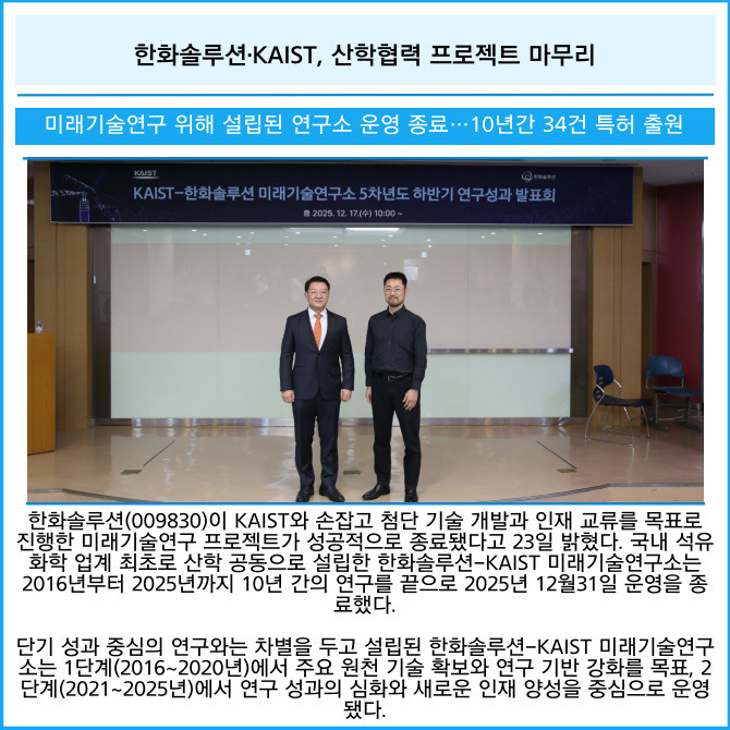 [카드] 한화솔루션·KAIST, 산학협력 프로젝트 마무리