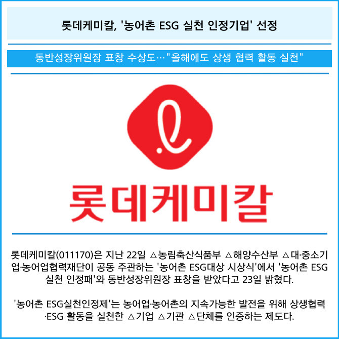 [카드] 롯데케미칼, '농어촌 ESG 실천 인정기업' 선정