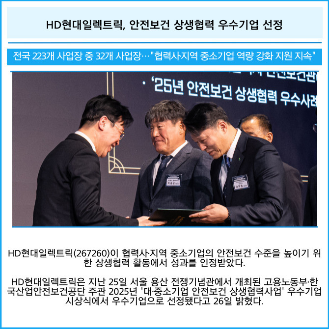 [카드] HD현대일렉트릭, 안전보건 상생협력 우수기업 선정