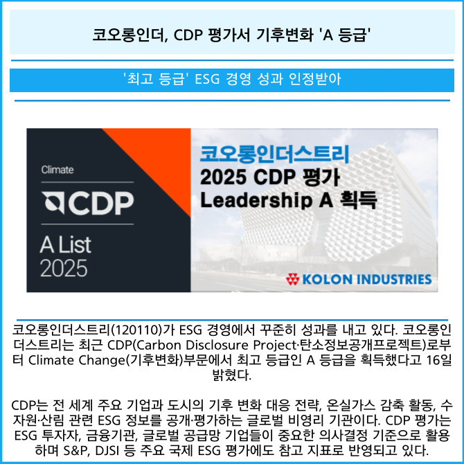 [카드] 코오롱인더, CDP 평가서 기후변화 'A 등급'