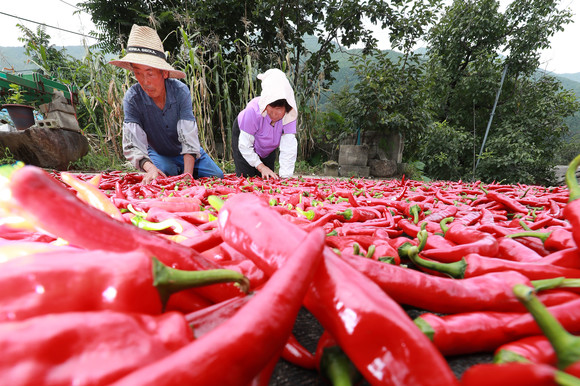 [포토] 함양군 장맛비 이기고 '잘 익은 고추' 말리기