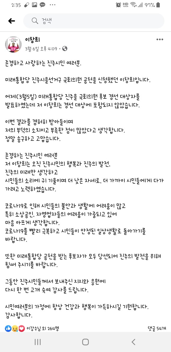 최상화 사천·남해·하동 미래통합당 후보, 경선 중립 호소문