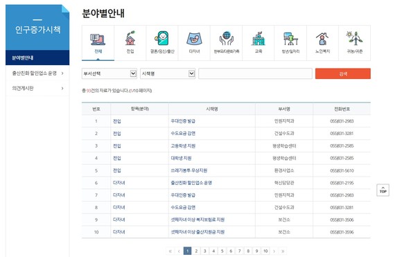 사천시, 홈페이지 생애주기별 인구증가시책 통합메뉴 구성