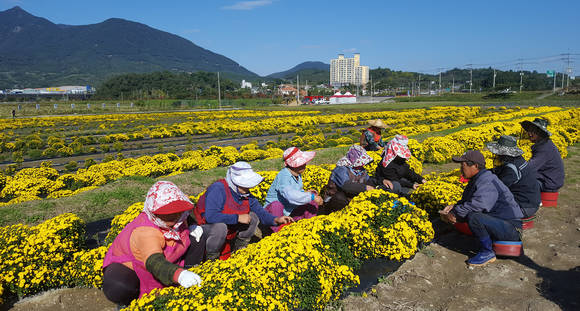 산청 약초재배단지, 국화꽃잎 수확 한창
