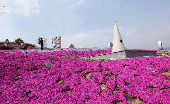 산청 생초국제조각공원 "진분홍빛 꽃잔디 장관"