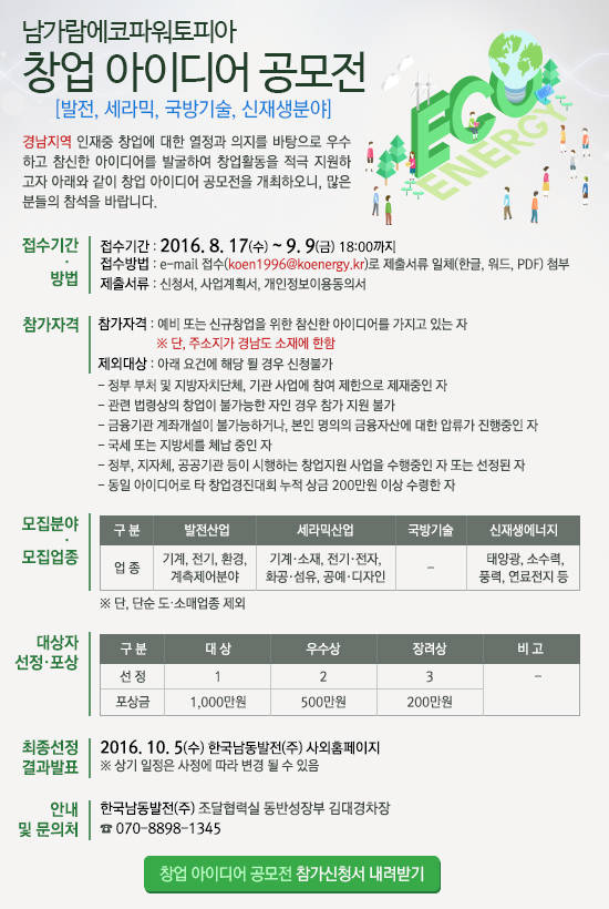 한국남동발전 남가람ECO, 창업 아이디어 공모전 개최