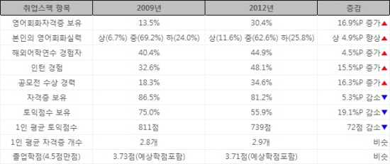 2009·2012년, 4년 대졸 신입구직자 취업스펙 비교