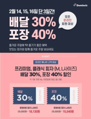 도미노피자, 3일간 '배달 30%·포장 40%' 할인