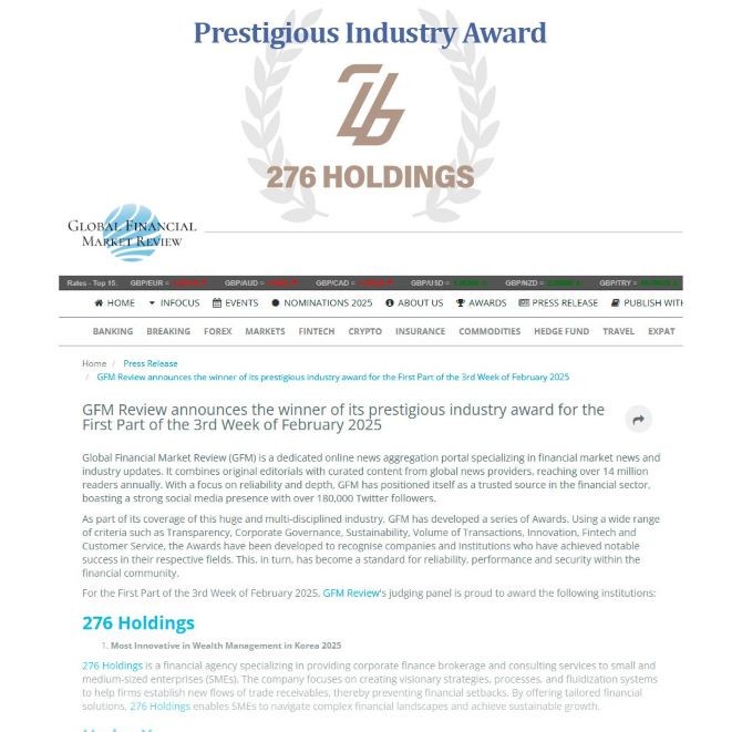276홀딩스, 영국 GFM Review 선정 '업계 최고 권위상' 수상