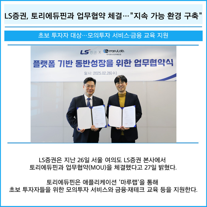 [카드] LS증권, 토리에듀핀과 업무협약 체결…"지속 가능 환경 구축"
