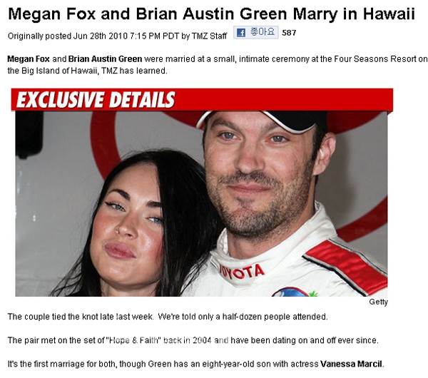 섹시스타 메간폭스, 오스틴그린과 하와이서 비밀결혼