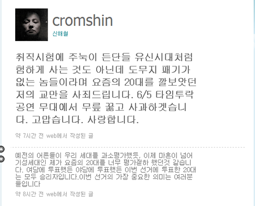 신해철, “20대 깔봤던 교만, 무릎꿇고 사죄”