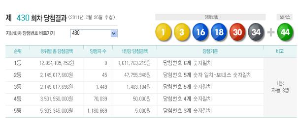 제430회 로또 당첨번호 ‘1,3,16,18,30,34’…1등 8명 16억