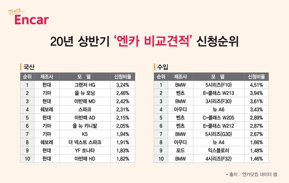 엔카닷컴, 비교견적 신청 1위 '현대차 그랜저 HG'